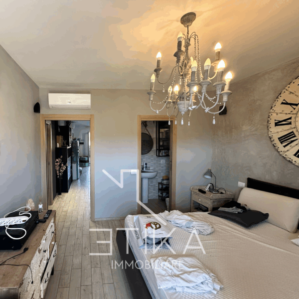 L’appartamento si distingue per la cura nei dettagli e per la distribuzione intelligente degli ambienti. La zona giorno si apre con un ampio e luminoso salone, integrato con un angolo cottura moderno e funzionale, perfetto per chi ama condividere momenti di convivialità in un ambiente elegante e confortevole. La zona notte è composta da una spaziosa camera matrimoniale con bagno en suite, che offre privacy e praticità, e da una seconda camera, attualmente adibita a cabina armadio, ma facilmente trasformabile in cameretta, studio o spazio personale a seconda delle necessità. Un secondo bagno di servizio completa la disposizione interna, garantendo comfort e comodità anche per gli ospiti.